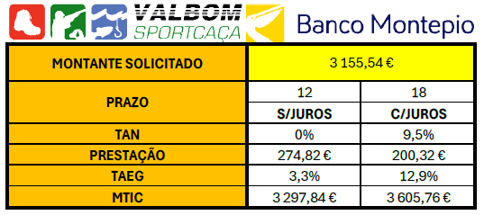 PRAZO Meses 18 24 PRESTAÇÃO 133,00 € 99,75 € S/JUROS MONTANTE SOLICITADO 2 394,00 € 2 394,00 € TAN 0,00% 0,00% COEF.SEGURO VIDA 0,00 € 0,01 € COM. PROC.PRESTAÇÃO 0,00 € 0,00 € IS 63,20 € 63,20 € SEGURO VIDA 10,11 € 13,24 € TAEG 4,00% 3,20% MTIC 2 467,31 € 2 470,44 €
