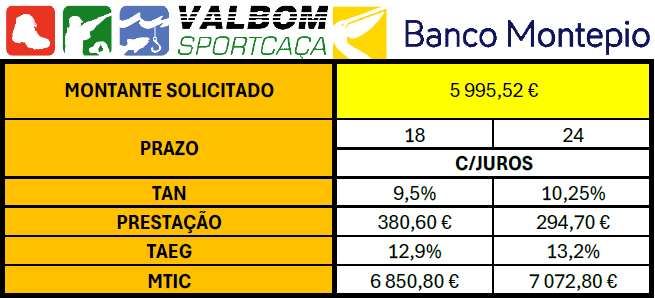 PRAZO Meses 18 24 PRESTAÇÃO 359,78 € 269,83 € S/JUROS MONTANTE SOLICITADO 6 476,00 € 6 476,00 € TAN 0,00% 0,00% COEF.SEGURO VIDA 0,00 € 0,01 € COM. PROC.PRESTAÇÃO 0,00 € 0,00 € IS 170,97 € 170,97 € SEGURO VIDA 27,35 € 35,82 € TAEG 4,00% 3,20% MTIC 6 674,36 € 6 682,71 €