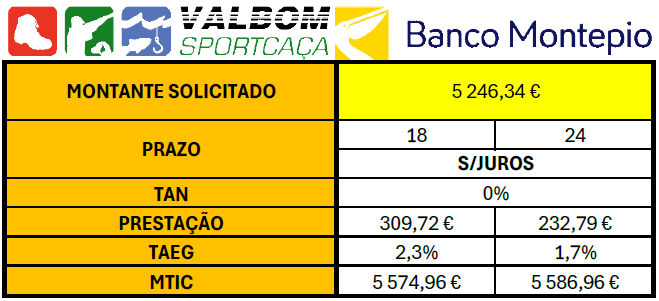 PRAZO Meses 18 24 PRESTAÇÃO 490,28 € 367,71 € S/JUROS MONTANTE SOLICITADO 8 825,00 € 8 825,00 € TAN 0,00% 0,00% COEF.SEGURO VIDA 0,4224 % 0,5531 € COM. PROC.PRESTAÇÃO 0,00 € 0,00 € IS 232,98 € 232,98 € SEGURO VIDA 37,28 € 48,81 € TAEG 4,00% 3,20% MTIC 9 095,30 € 9 106,83 €