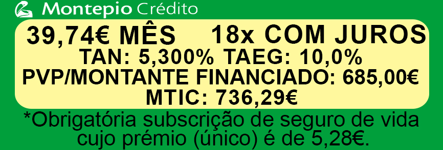 PRAZO Meses 18 24 PRESTAÇÃO 77,82 € 59,72 € C/JUROS MONTANTE SOLICITADO 1 319,00 € 1 319,00 € TAN 7,40% 7,80% COEF.SEGURO VIDA 0,00 € 0,01 € COM. PROC.PRESTAÇÃO 0,00 € 0,00 € IS 34,82 € 34,82 € SEGURO VIDA 5,57 € 7,30 € TAEG 12,40% 12,00% MTIC 1 441,15 € 1 475,40 €
